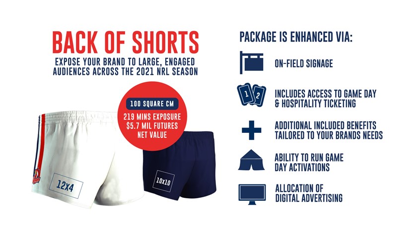 Opportunities to feature throughout Sydney Roosters games with branding across both NRL and NRLW trainers and in-stadium signage.