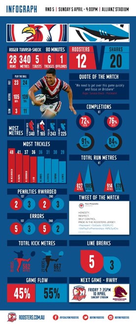 Check out the Round 5 Match Infographic following our battle with the Sharks. Includes; stand out players, most tackles, errors and line breaks, plus our Tweet and Quote of the Week!