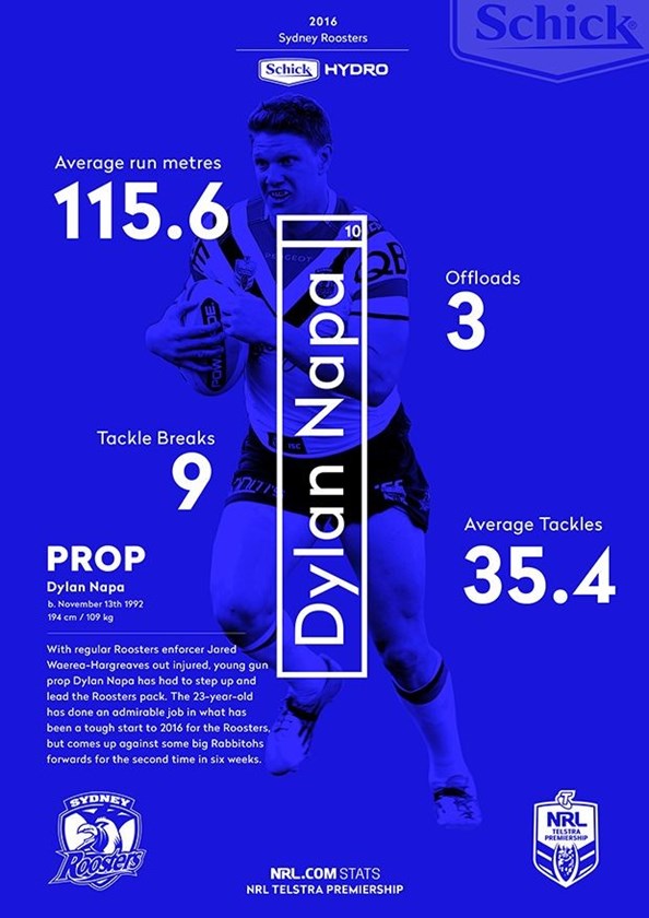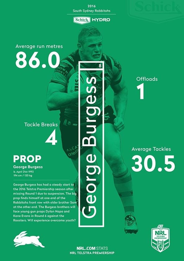 Rabbitohs front-rower George Burgess takes on Roosters prop Dylan Napa in a Round 6 Telstra Premiership derby. Check out the Schick Hydro stats match-up.