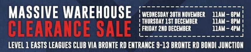 The Official Roosters Merchandise Store will be holding a warehouse sale Wednesday through to Friday this week at Easts Leagues Club, Bondi.