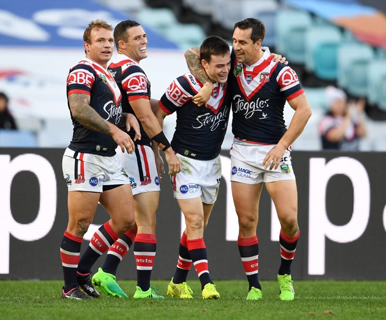 Having struck gold with their first attacking raid, the Roosters went straight back to their lethal left edge in the next set with Tupou popping a subline offload to Mitchell who delivered a pass off the ground back inside that was fumbled straight into the arms of Jake Friend who raced around to score his second try in as many weeks.