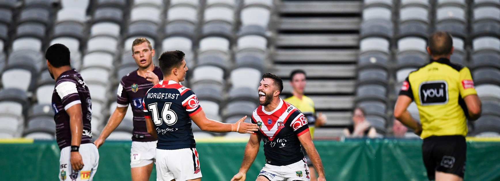 James Tedesco scored his first points in a Sydney Roosters jersey showing his usual touch of class with two second-half tries to help propel his side to a slim 28-26 lead over the Manly Sea Eagles at Central Coast Stadium.