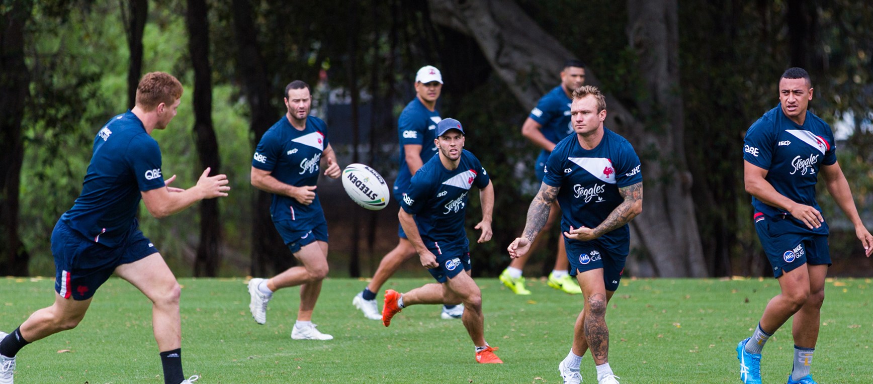 The boys ran through some light field work drills following Saturday night's trial match win over the Sea-Eagles. The drizzly Sydney weather gave the squad a chance to talk through the match and iron out some techniques.