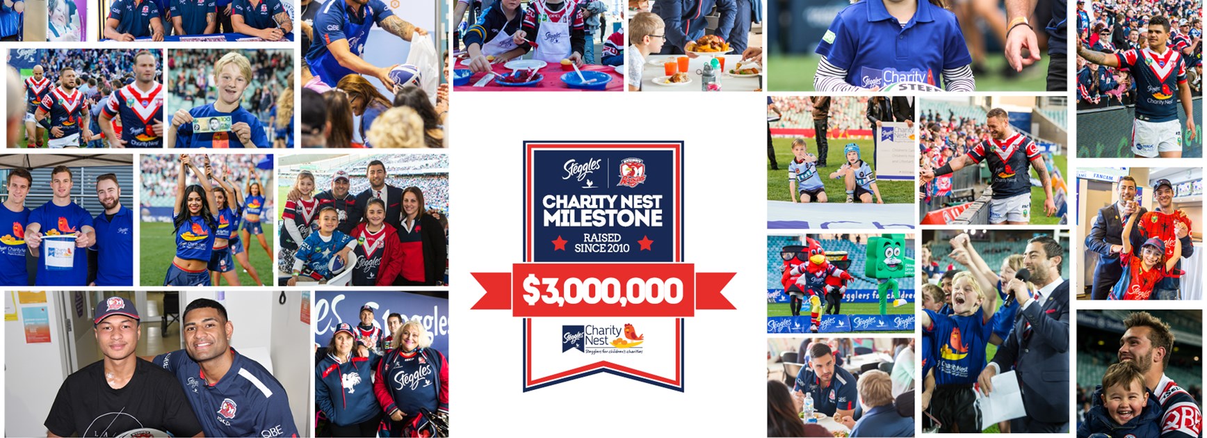 The Steggles Roosters Charity Nest has hit the magic three-million-dollar mark following the Round 19 match between the Sydney Roosters and Manly-Warringah Sea Eagles.
