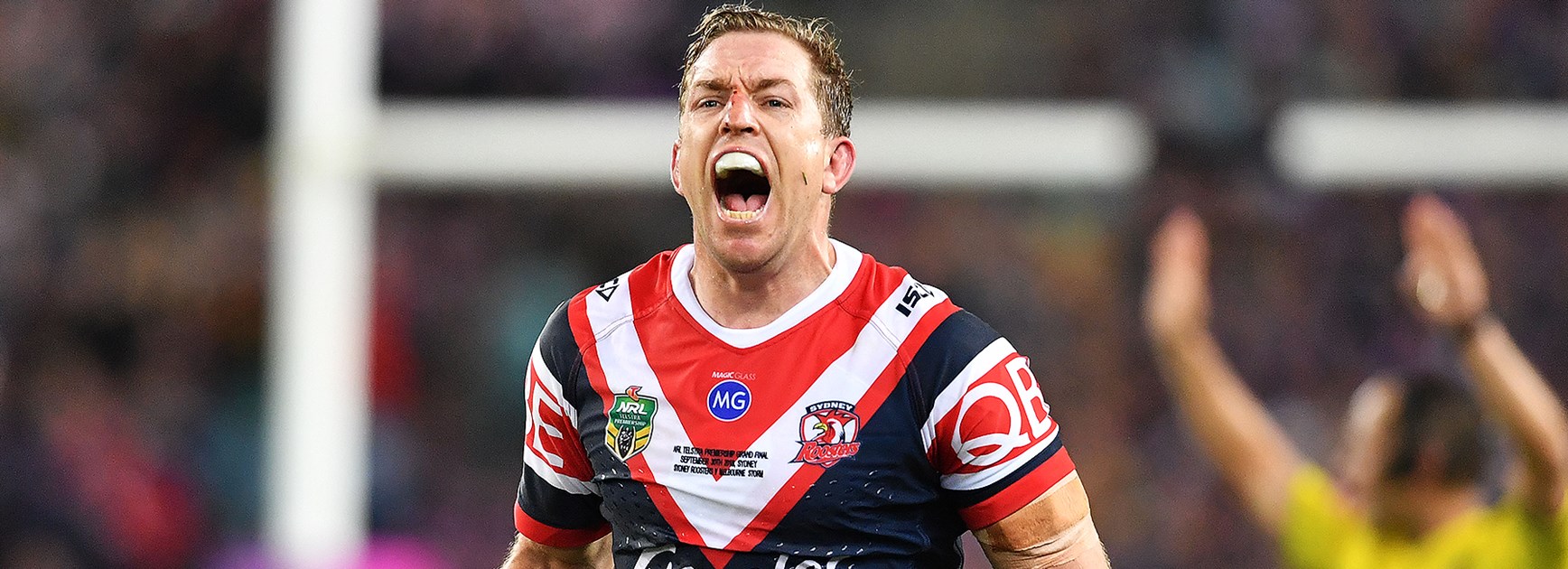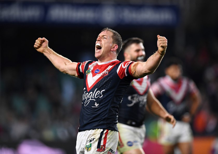 Aubusson shows emotion after his side's Qualifying Finals victory over the Sharks.