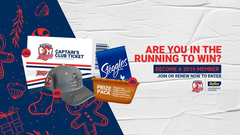 Roosters Members that sign up before Friday the 14th of December at 2PM will go in the running to win up to three awesome prizes, including 2x Captain's Club Corporate Hospitality Tickets, a signed Cooper Cronk Premiership cap and a Steggles Prize Pack.