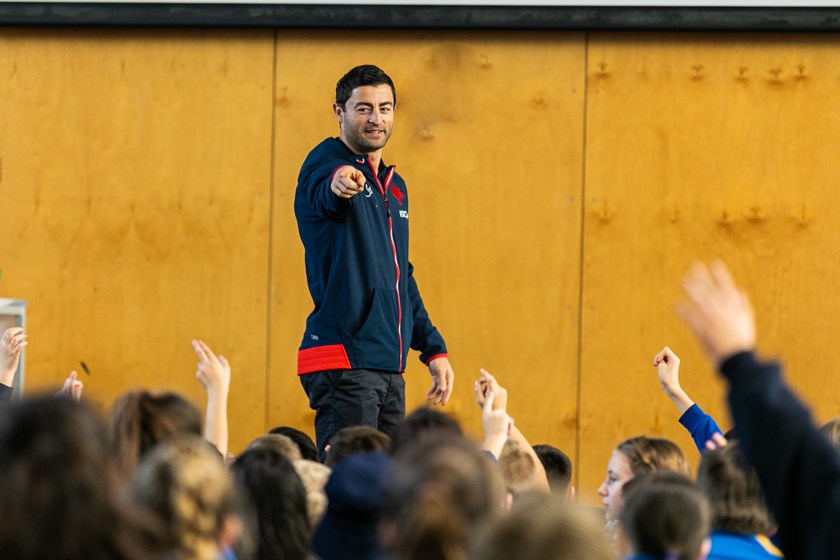 The Roosters went back to school in Adelaide by visiting over 3,000 local primary and secondary students promoting messages of Wellbeing and Respect. Key messages of exercise, hydration, nutrition and sleep were endorsed by Club Ambassador Anthony Minichiello and NRLW Captain Simaima Taufa.