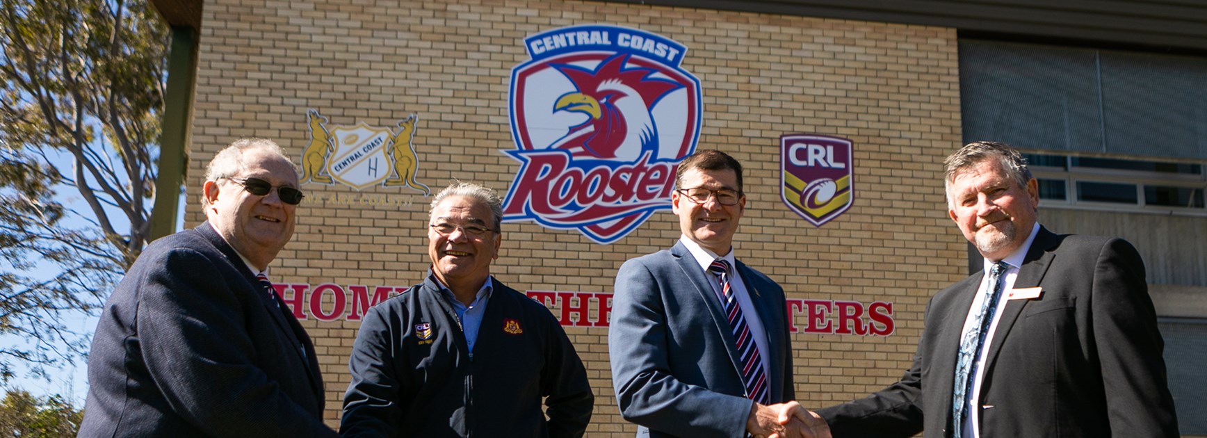 In attendance at the announcement were CRL CEO Terry Quinn, Tuggerah Lakes Secondary College Principal Dr David Cullen and Roosters Director Brien Samphier.