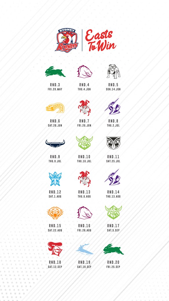 The Sydney Roosters full 2020 NRL Telstra Premiership draw is listed below.