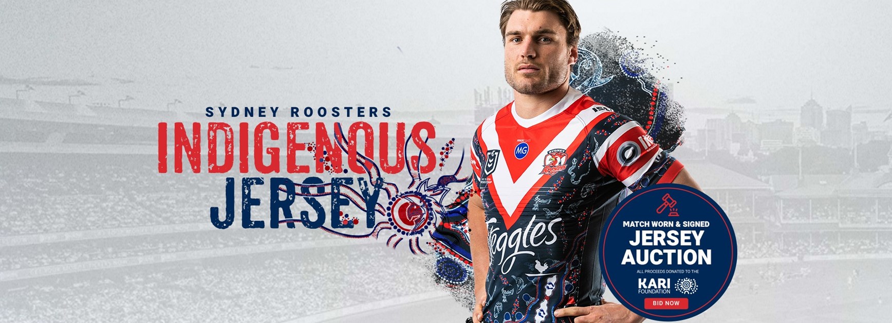The Sydney Roosters match worn and signed 2020 Indigenous jerseys are now available for bids through online auction, with all proceeds to be donated to the KARI Foundation.