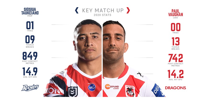 Prop for Dragons is number 8 Blake LawrieProp for Roosters is number 10 Siosiua Taukeiaho