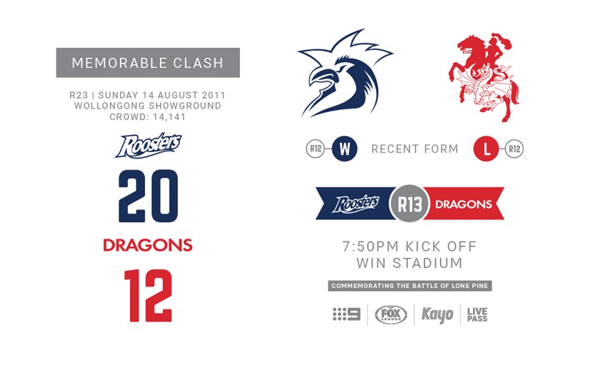 The Sydney Roosters and St George Illawarra Dragons are set to do battle on Thursday night football on the 105th anniversary of The Battle Of Lone Pine at Win Stadium.
