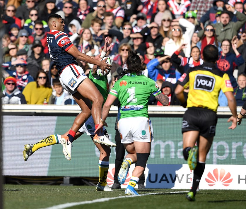 It only took the Roosters ten minutes to re-compose and earn the momentum back when Latrell Mitchell capitalised on a dropped ball from Raiders fullback Charnze Niccol-Klokstad.