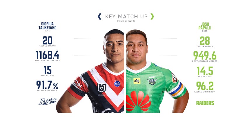 Prop for Raiders is number 8 Josh PapaliiProp for Roosters is number 8 Jared Waerea-Hargreaves