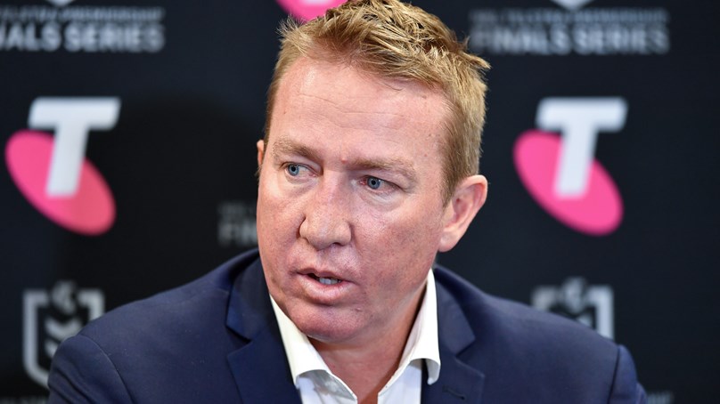 Trent Robinson chats to the media after his team's Finals Week 2 game against the Raiders