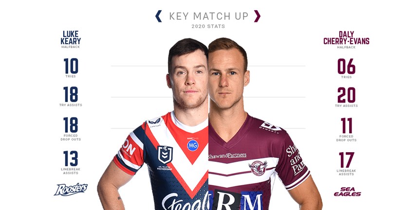 Halfback for Roosters is number 7 Luke KearyHalfback for Sea Eagles is number 7 Daly Cherry-Evans