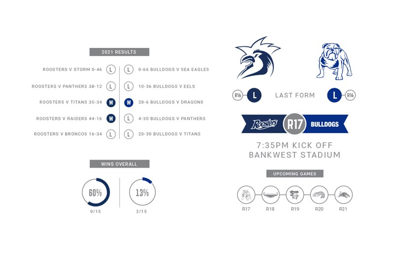 While both sides sit at very different positions on the ladder, there will be a similar motivation to take home the two competition points, with the Roosters looking to keep in touch with the top four, and the Bulldogs looking to uproot themselves from the bottom of the table.