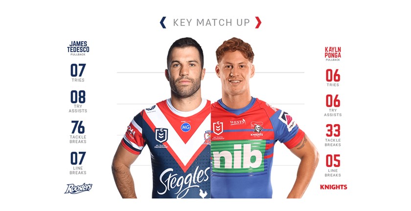 Fullback for Roosters is number 1 James TedescoFullback for Knights is number 1 Kalyn Ponga