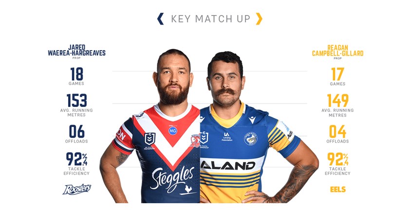 Prop for Roosters is number 8 Jared Waerea-HargreavesProp for Eels is number 8 Reagan Campbell-Gillard