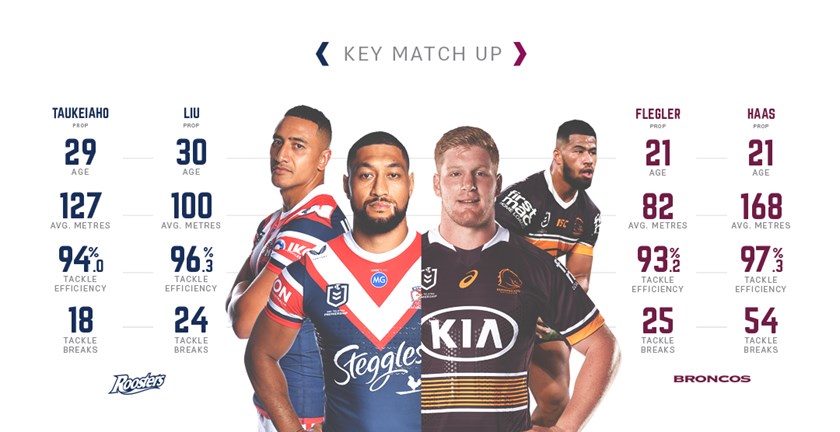 Prop for Broncos is number 10 Payne HaasProp for Roosters is number 10 Siosiua Taukeiaho