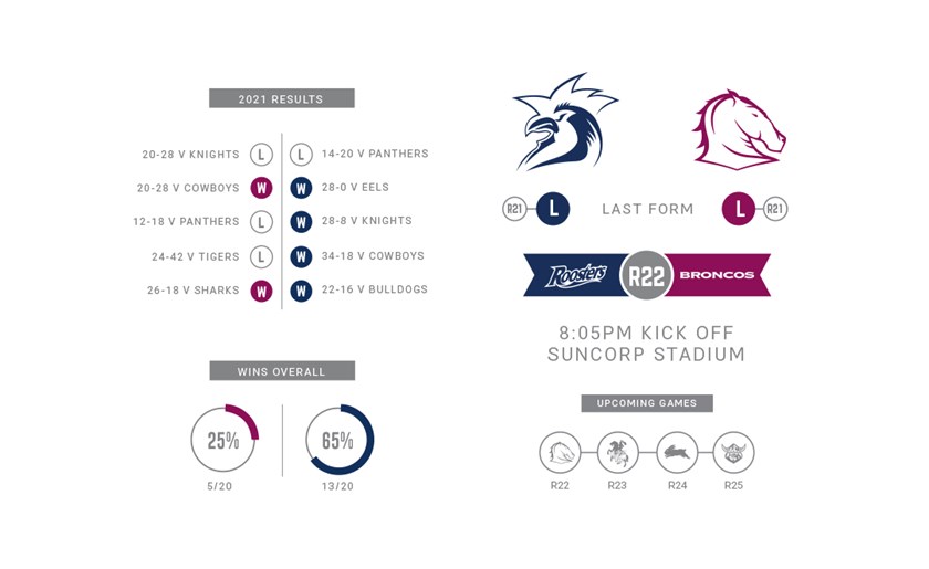 The Roosters and Broncos will play for the 55th time on Friday night, with the Tricolours playing their third match at Suncorp Stadium this season.