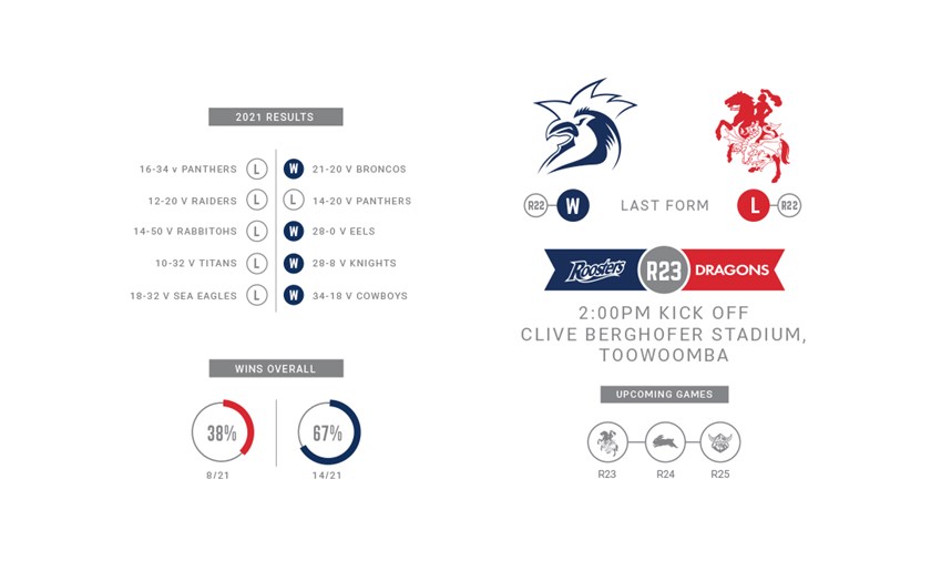 The Sydney Roosters and St George Illawarra Dragons will clash for the 45th time on Sunday afternoon at Clive Berghofer Stadium in Toowoomba, with the Tricolours currently holding a six-game winning streak over their opponents going back to 2018.