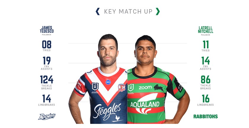 Fullback for Roosters is number 1 James TedescoFullback for Rabbitohs is number 1 Latrell Mitchell