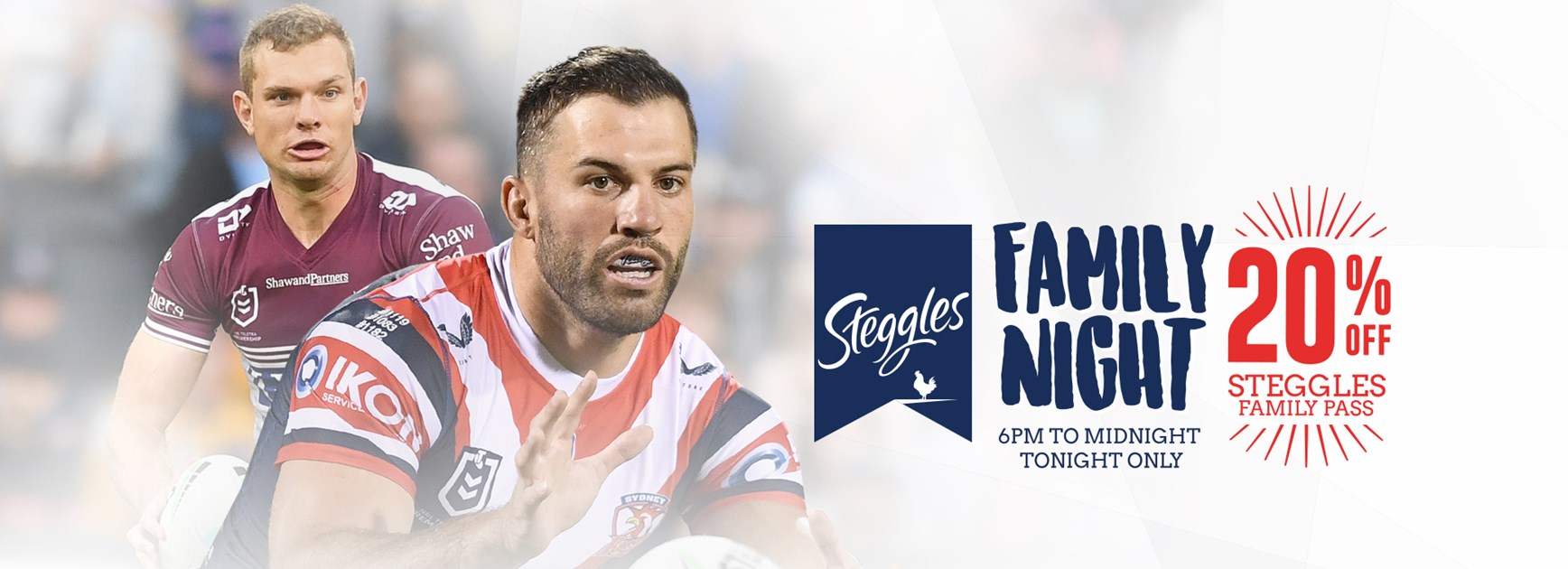 Every Wednesday throughout the 2022 Season from 6pm-12am, the Steggles Family Night will let you purchase the Steggles Family Pass for 20% off leading into every Sydney Roosters home game!