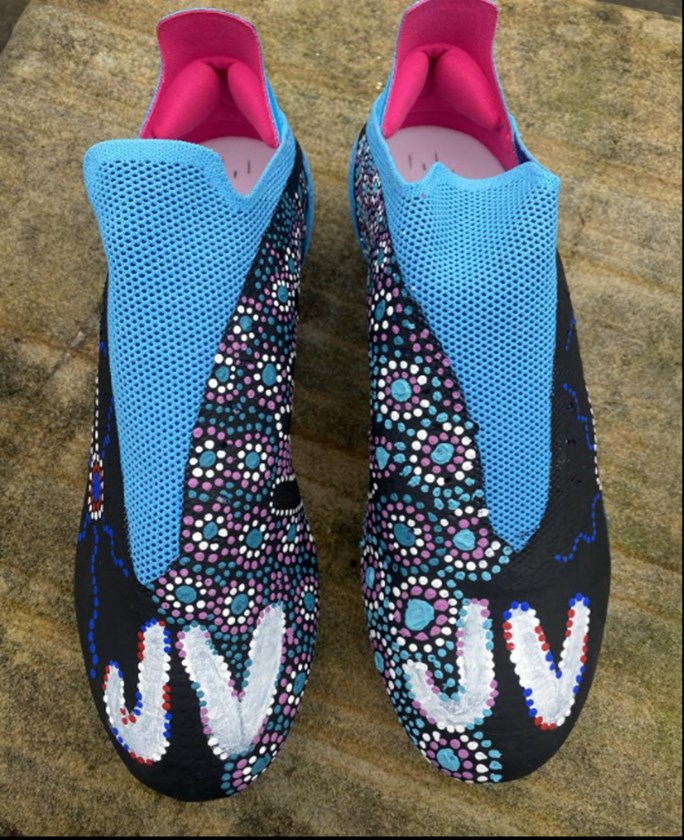 Although he will not take the field on Saturday, the boots dedicated to Sam Verrills feature the initials of his late brother in a heartwarming tribute, with the design curated by Ngemba woman Jalyah Boney.