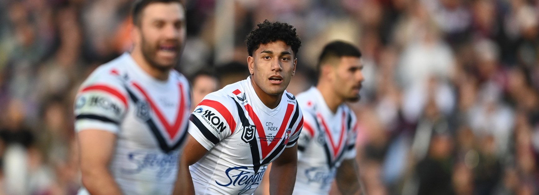 Fiercely fighting to defend their line, the Roosters stood tall after conceding two goal line drop-outs and two set restarts. A brilliant tackle from Nat Butcher and James Tedesco denied Josh Schuster the opening try, with Joseph Manu's involvement one set later interrupting the attacking flow and alleviating pressure for the visitors.