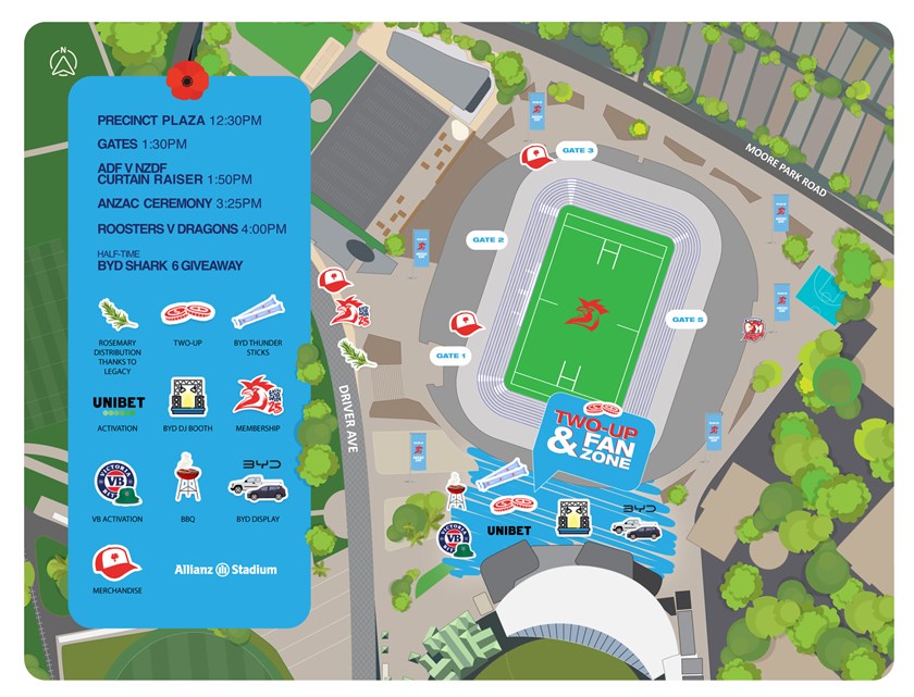 Precinct activations commence from 12:30pm in the Fan Zone Plaza, while gates will open at 1.30pm, with the Australian Defence Forces v New Zealand Defence Force curtain raiser starting at 1.50pm. The Anzac Day Ceremony will commence at 3.25pm with the NRL fixture kicking off at 4.00pm.