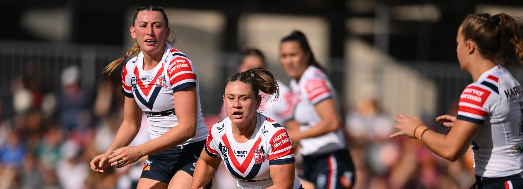 Half-time: After the Roosters dominated possession early in the half, the Broncos managed to wrestle back 43 per cent of possession at the break. The Roosters controlled the match well completing 14 of 19 sets at 73 per cent while the Broncos completed at 53 per cent (8 of 15 sets). Tara McGrath-West is ruled out with a foot injury and won’t return.