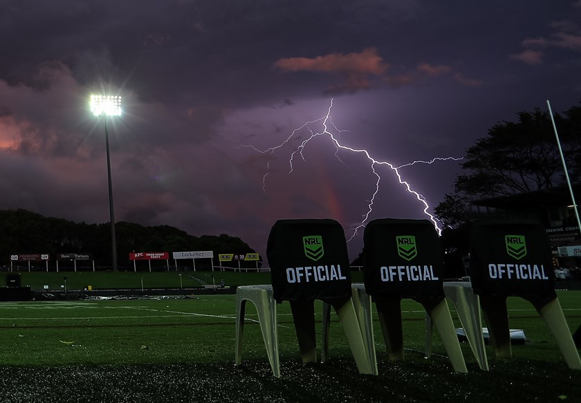 7.15pm The clash between the Sea Eagles and Roosters is expected to kick off on time at 8.00pm. The ground was hit by a storm and lightning and the floodlights were turned off as a precaution but the lights are now back on and lightning is heading out to sea. Players will be able to go onto the field for their warm-up and kick-off should be on time at 8.00pm.